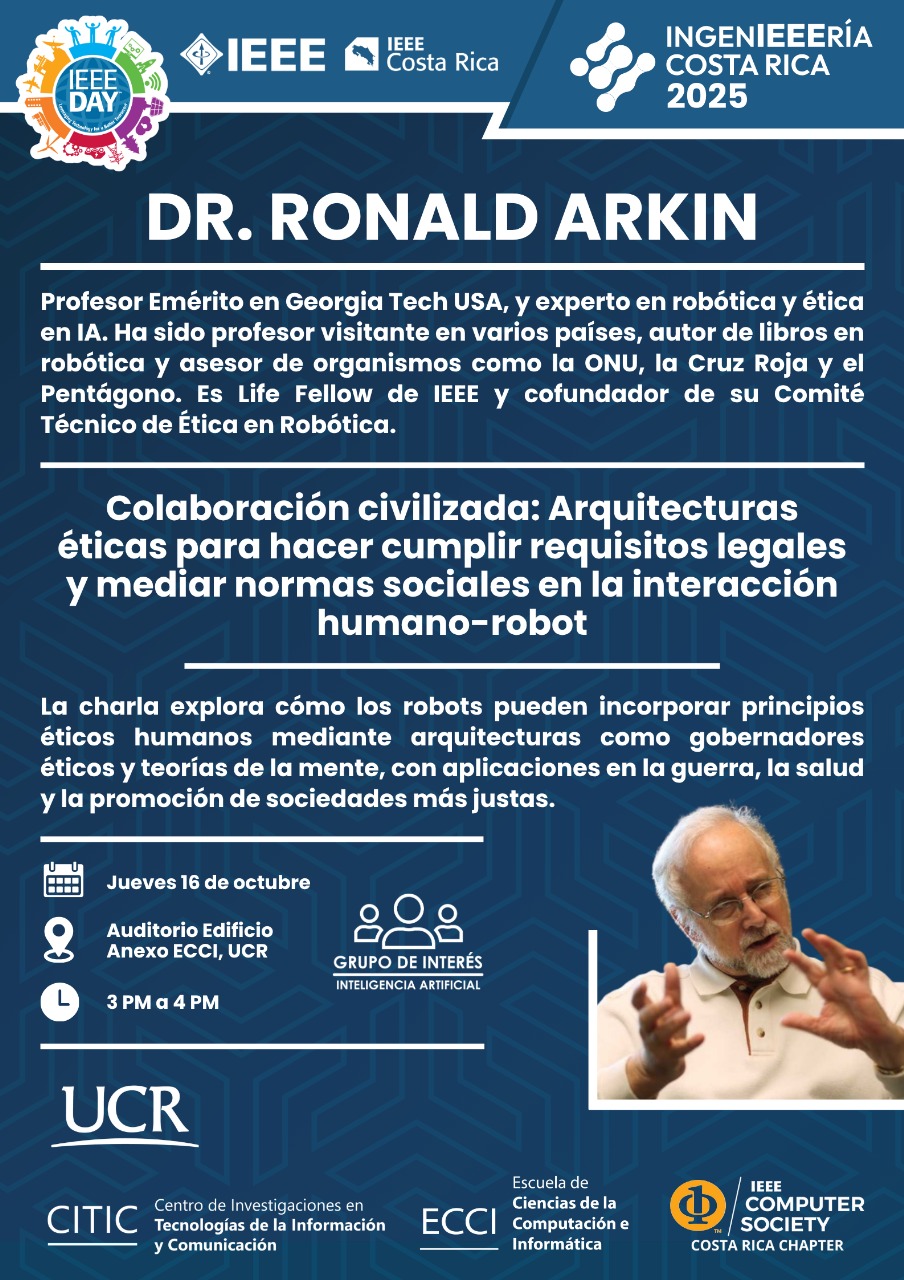 Nos complace invitarle a la charla titulada "Colaboración civilizada: Arquitecturas éticas para hacer cumplir requisitos legales y mediar normas sociales en la interacción humano-robot", impartida por el Dr. Ronald Arkin. Esta charla forma parte del grupo de Interés en Inteligencia Artificial.