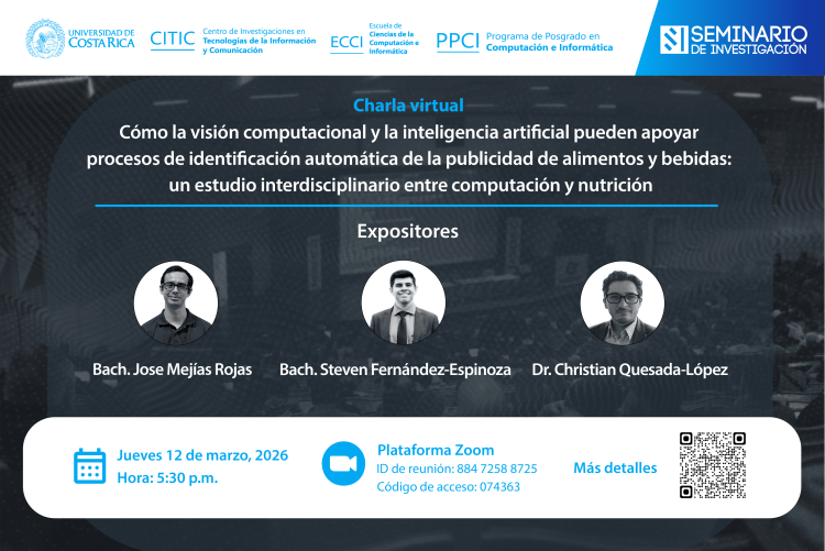 Nos complace invitarle a la charla virtual titulada "Cómo la visión computacional y la inteligencia artificial pueden apoyar procesos de identificación automática de la publicidad de alimentos y bebidas: un estudio interdisciplinario entre computación y nutrición", que será impartida por Bach. Jose Mejías Rojas, Bach. Steven Fernández-Espinoza y Dr. Christian Quesada-López. Esta charla forma parte de nuestro Seminario de Investigación y además será transmitida en vivo a través de Youtube.