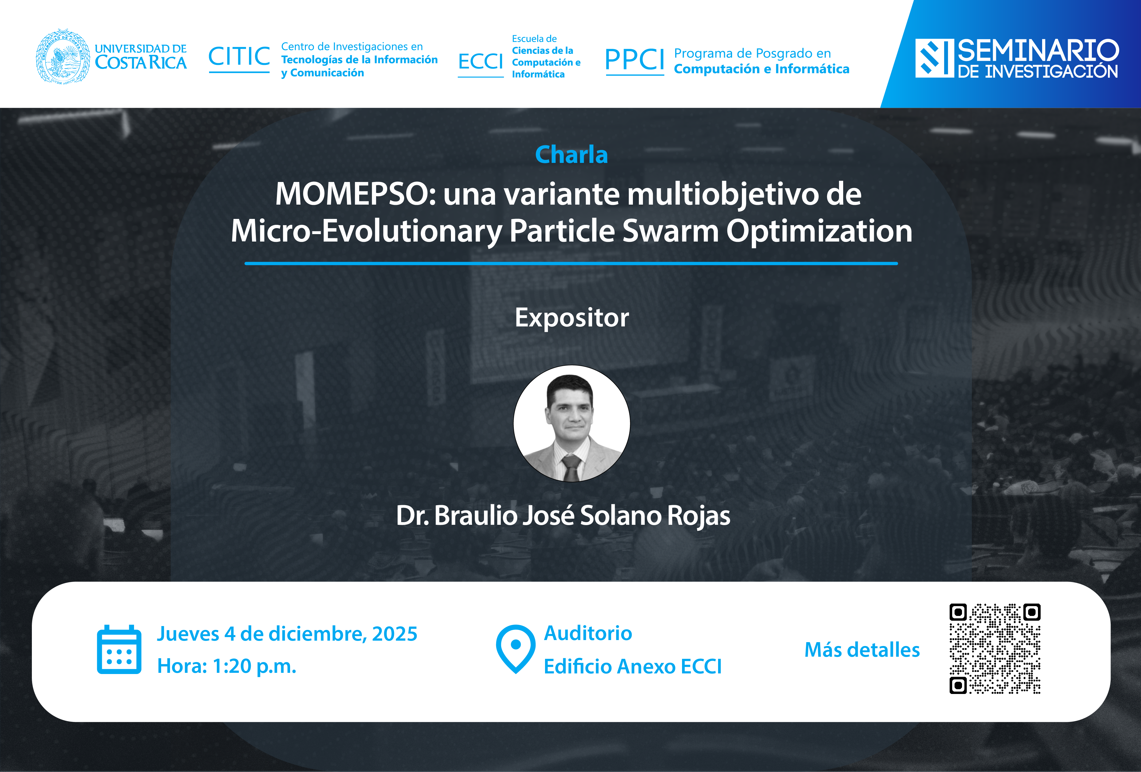 Nos complace invitarle a la charla titulada "MOMEPSO: una variante multiobjetivo de Micro-Evolutionary Particle Swarm Optimization", impartida por el Dr. Braulio José Solano Rojas. Esta charla forma parte de nuestro Seminario de Investigación y además será transmitida en vivo a través de Youtube.