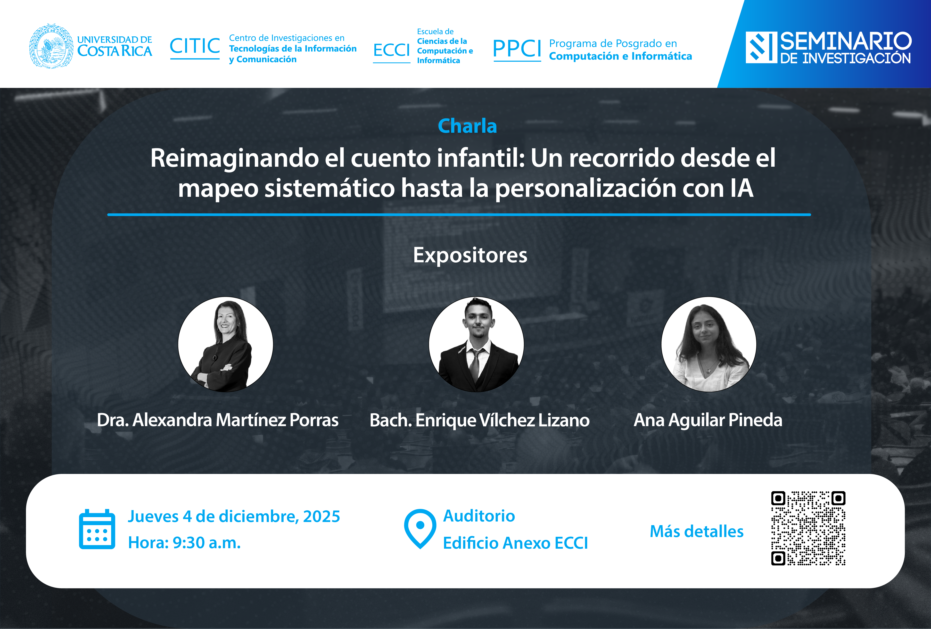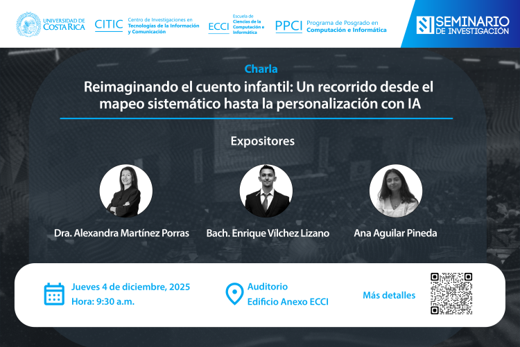 Nos complace invitarle a la charla titulada "Reimaginando el cuento infantil: Un recorrido desde el mapeo sistemático hasta la personalización con IA", impartida por la Dra. Alexandra Martínez Porras, Bach. Enrique Vílchez Lizano y Ana Aguilar Pineda. Esta charla forma parte de nuestro Seminario de Investigación y además será transmitida en vivo a través de Youtube.