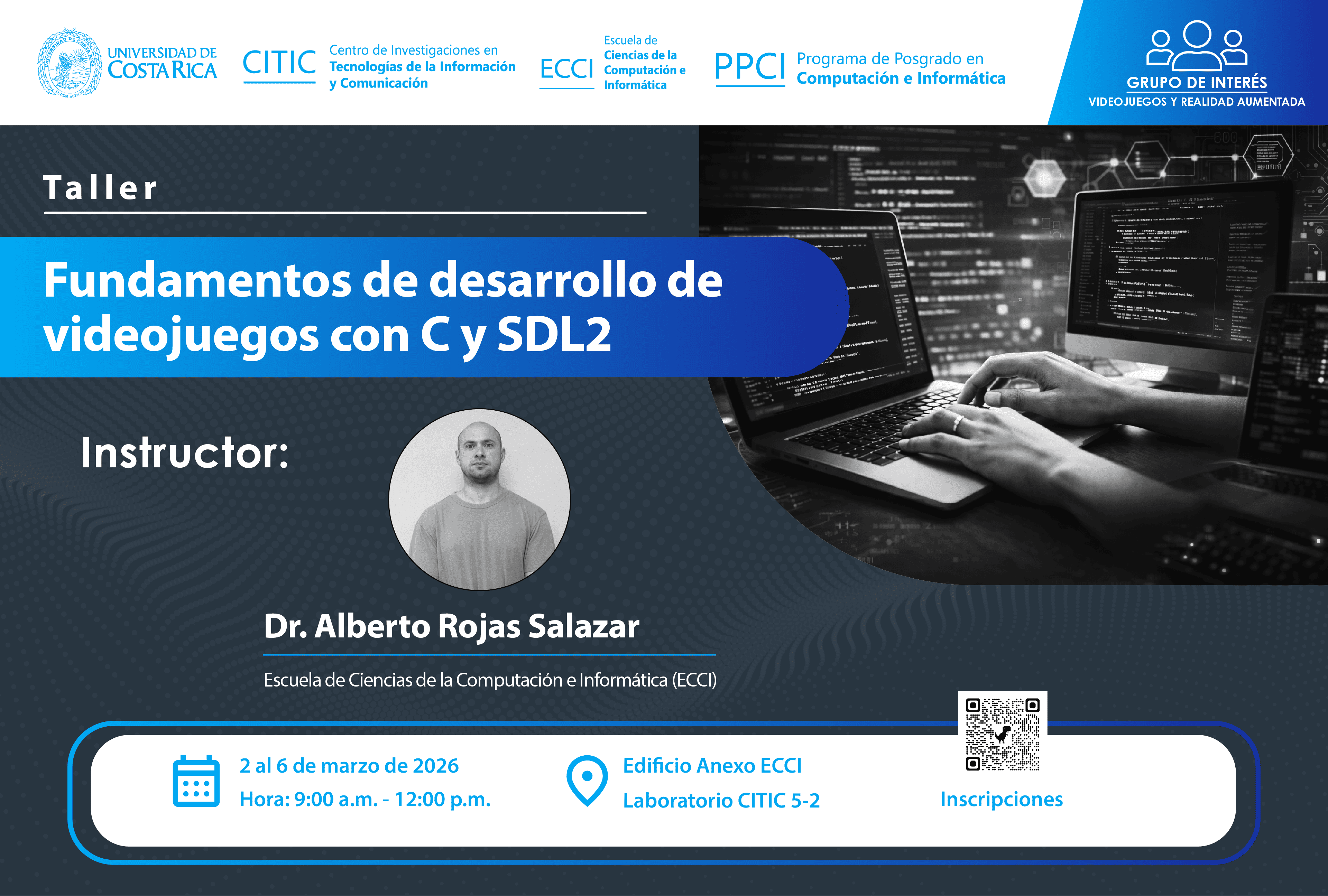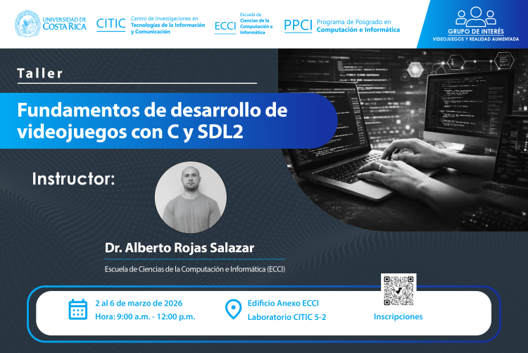 Nos complace invitarle al taller titulado "Fundamentos de Desarrollo de Videojuegos con C y SDL2", el cual será impartido por el Dr. Alberto Rojas Salazar. Este taller forma parte del Grupo de Interés en Videojuegos y Realidad Aumentada.