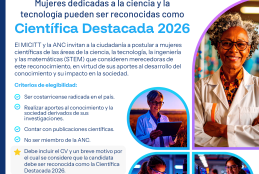 El MICITT y la ANC invitan a la cuidadanía a postular a mujeres científicas de las áreas de la ciencia, la tecnología, la ingeniería y las matemáticas (STEM) que consideren merecedoras de este reconocimiento, en virtud de sus aportes al desarrollo del conocimiento y su impacto en la sociedad.